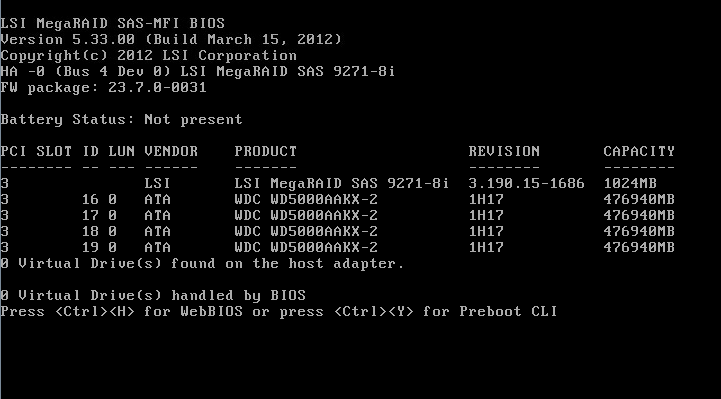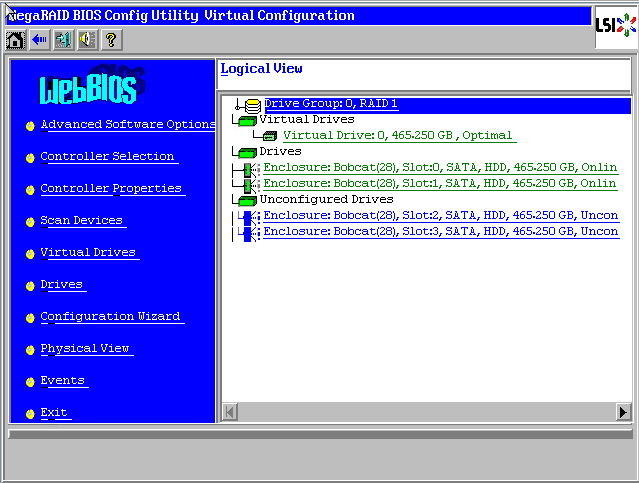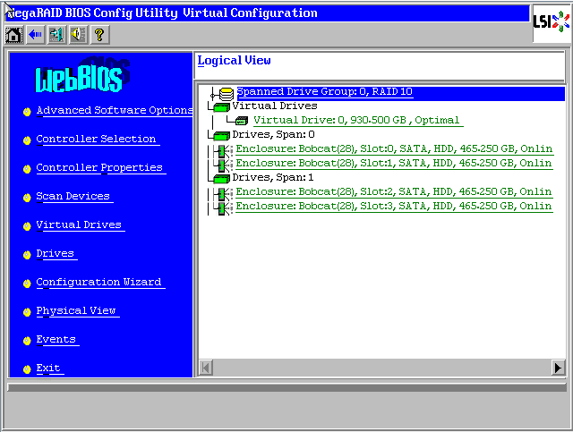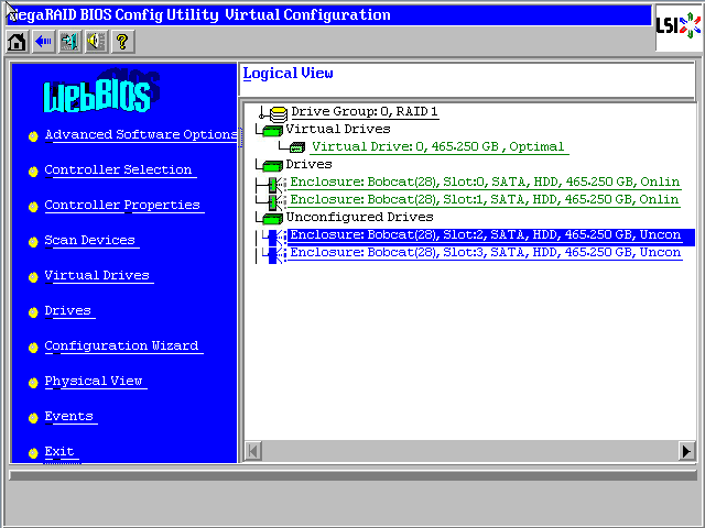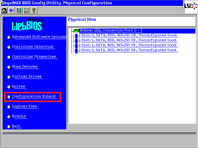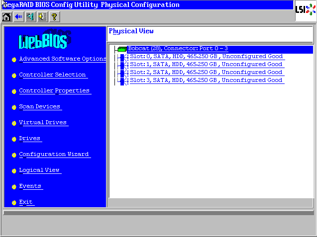 Raid卡首页叫作WebBIOS,如下图。左侧是功能菜单,右侧可以看到所有物理磁盘,本例安装了4块500G硬盘,后面所有的配置都可以在这里完成!