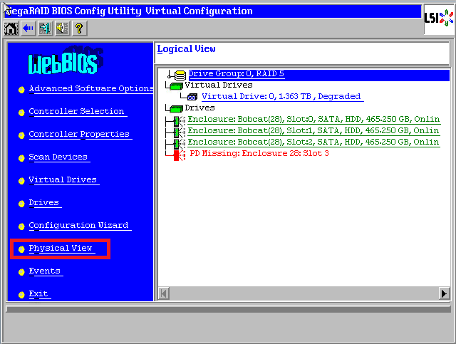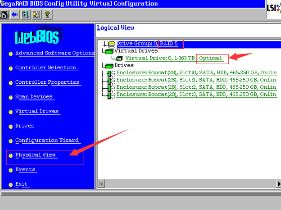 进入WebBIOS主页,发现一块硬盘显示红色PD Missing状态,同时阵列降级变成了蓝色Degraded状态,此时数据还是可用的,点击【Physical View】进入物理视图。