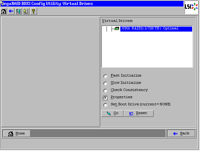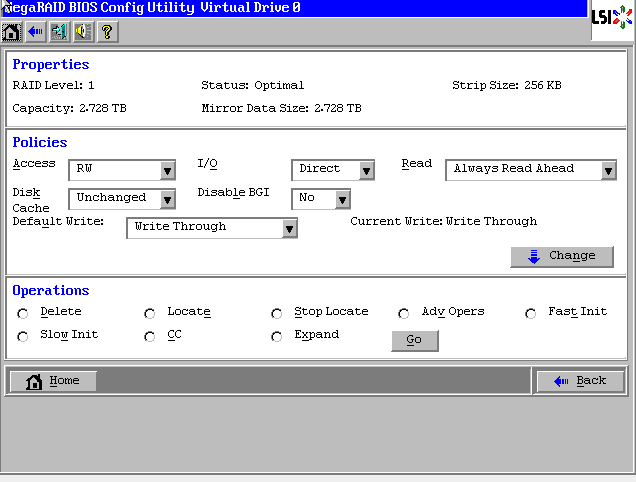 Raid1状态显示“Optimal”表示正常,Drives显示两块硬盘绿色Online正常,如果还有其它未使用的硬盘,会在unconfigured Drives下面蓝色显示。