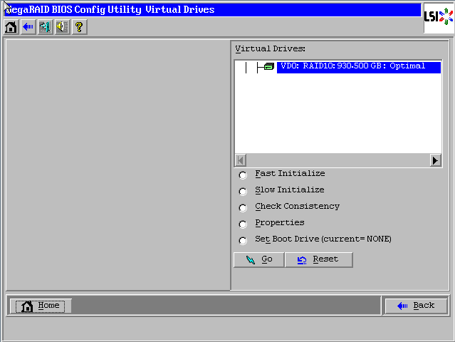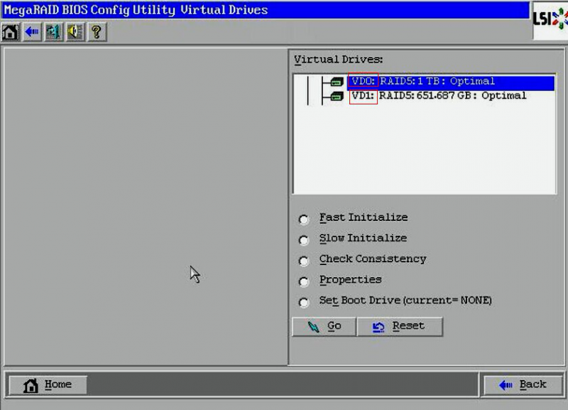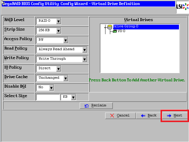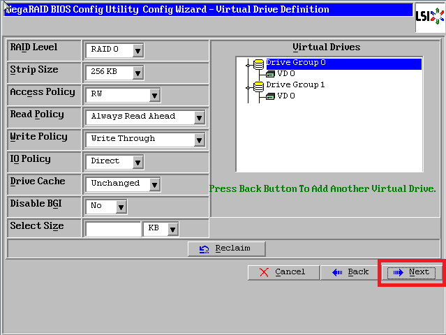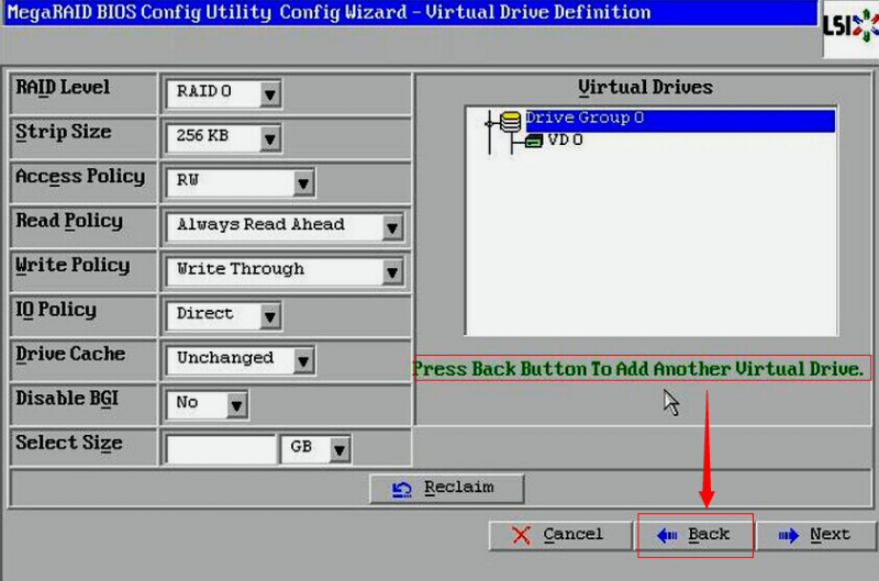 首先按正常配置把第一个VD创建分区完成到如下截图,可见右侧只有一个VD(注意要选择back噢)