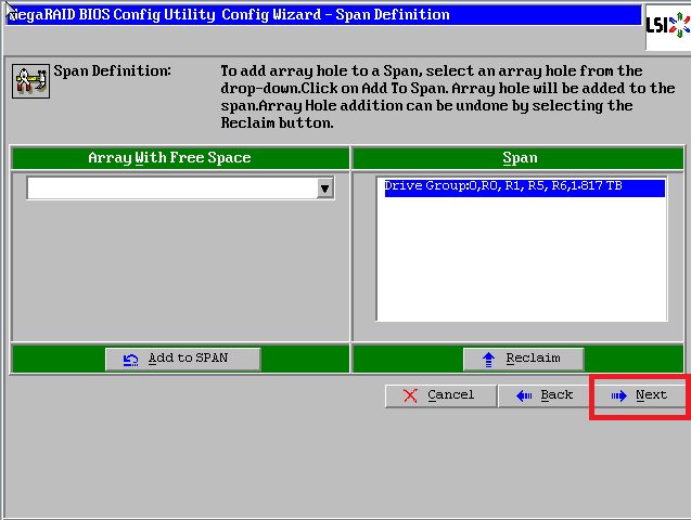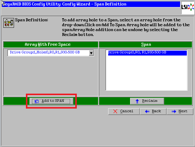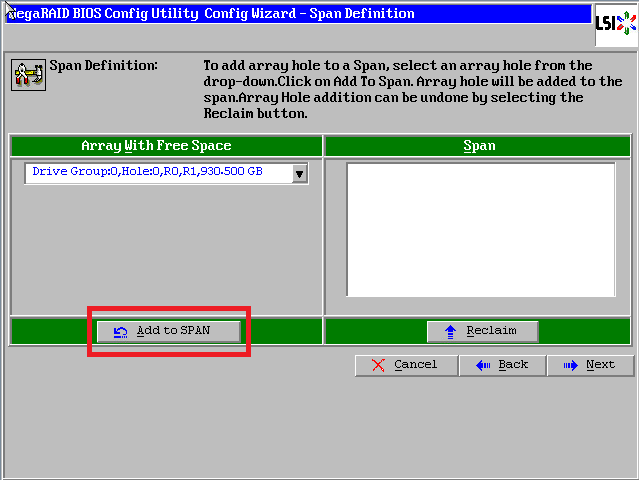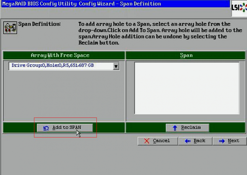 点击【Add to SPAN】,将刚才创建好的磁盘组加入到右侧方框内