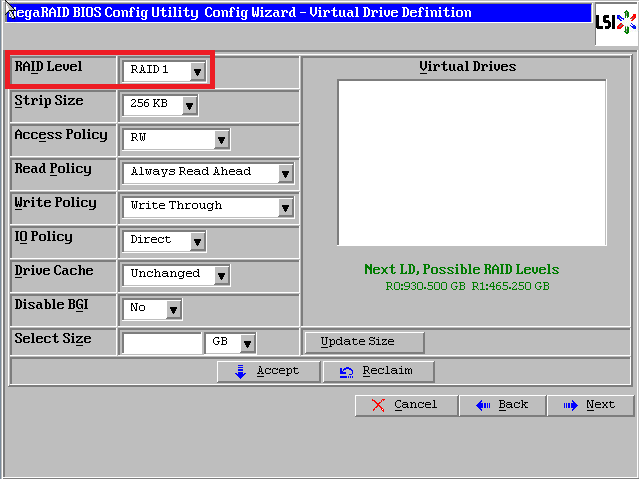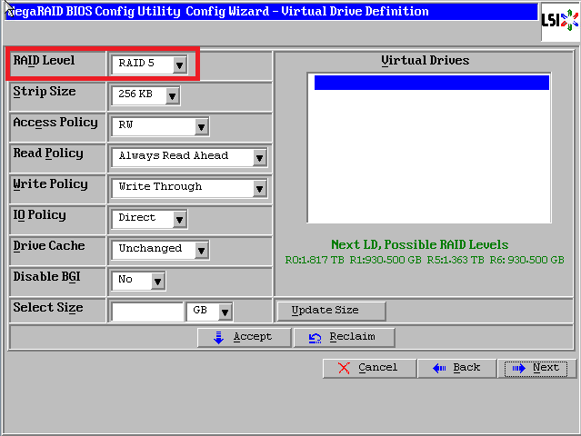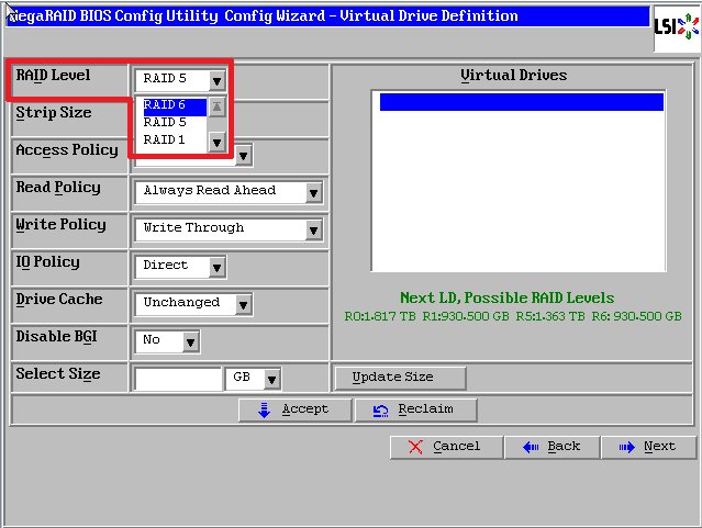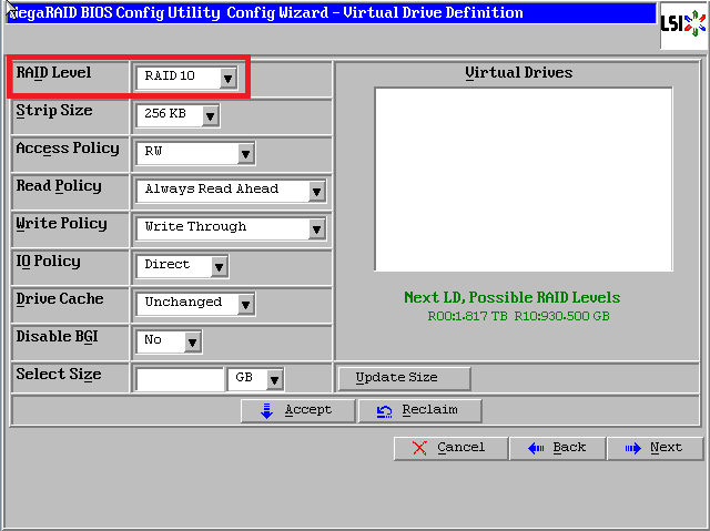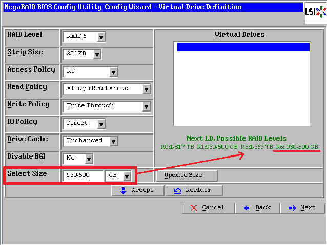 最后一个参数“Select Size”输入阵列容量大小,最大值可参考右侧绿字提示(其中R10代表做Raid10的最大容量),完成后点击【Accept】