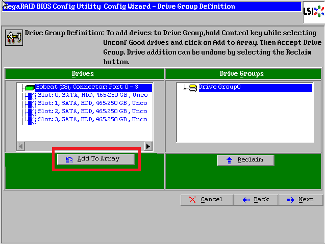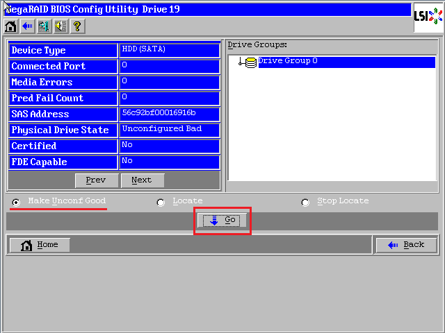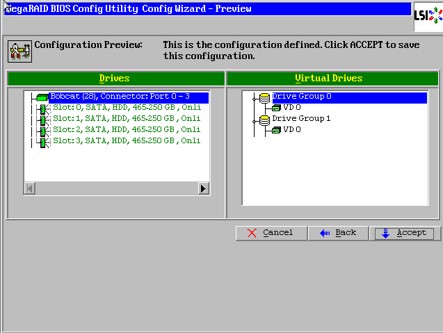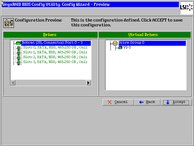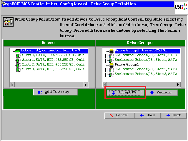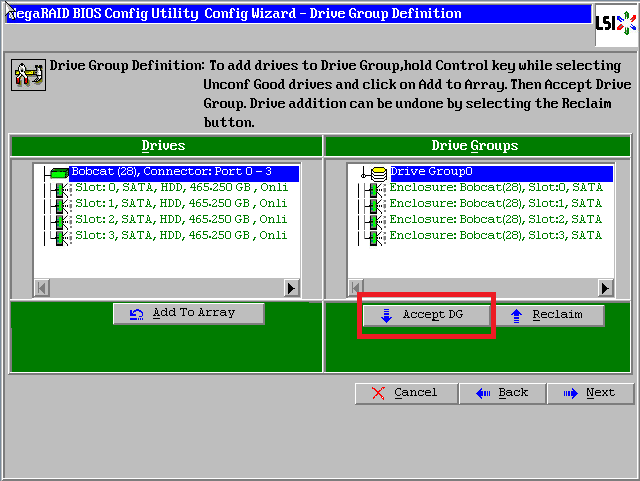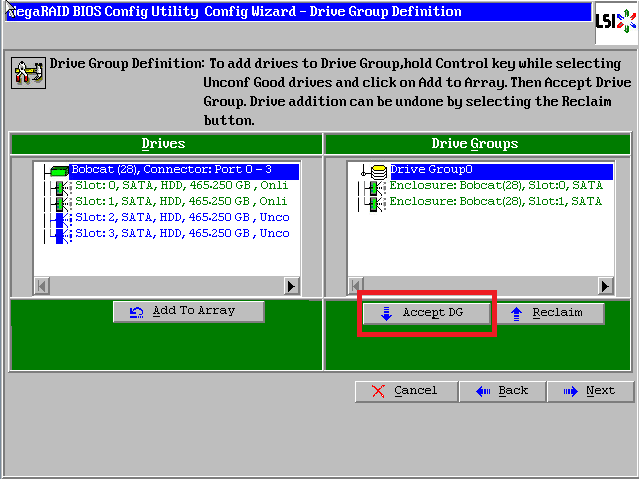 点击【Accept DG】,创建第一个磁盘组:Drive Group0
