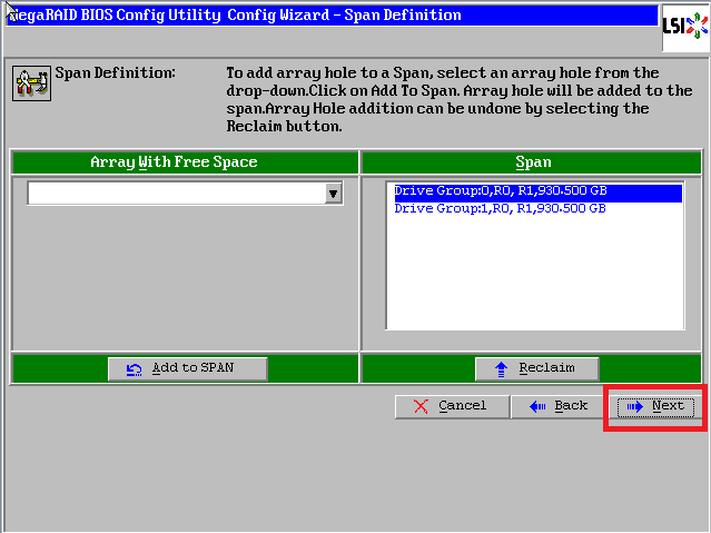 点击【Add to SPAN】,将刚才创建好的两个磁盘组分别加入到右侧方框内
