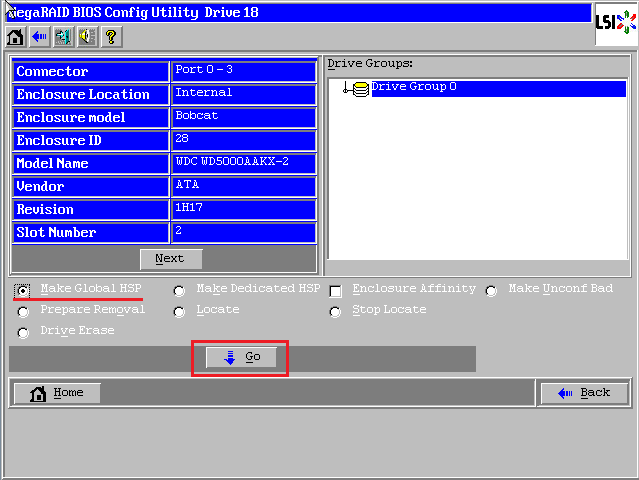 选择【Make Global HSP】,点击【GO】执行 ( 此处可以创建两种热备,分别是全局热备Global HSP和专用热备,建议选择全局热备即可 )