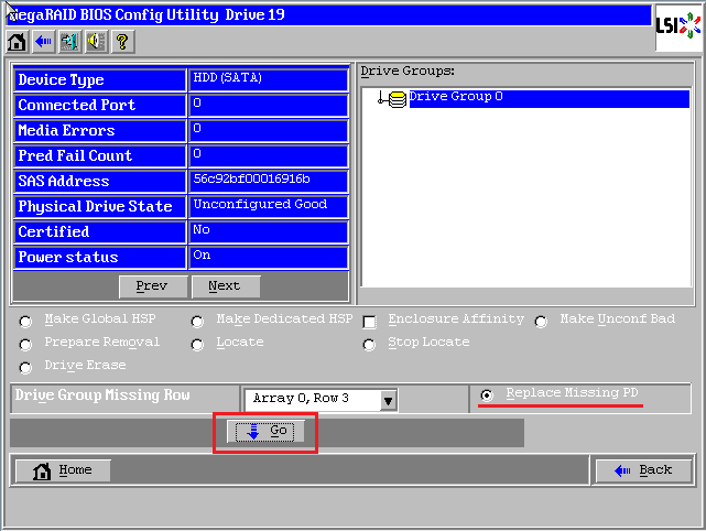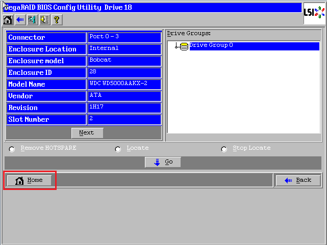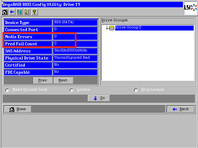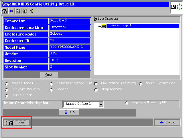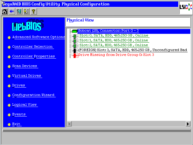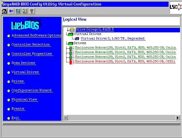 进入WebBIOS主页,发现一块硬盘显示红色Offline状态,同时阵列降级变成了蓝色Degraded状态,此时数据还是可用的,选中红色硬盘进入属性页面。