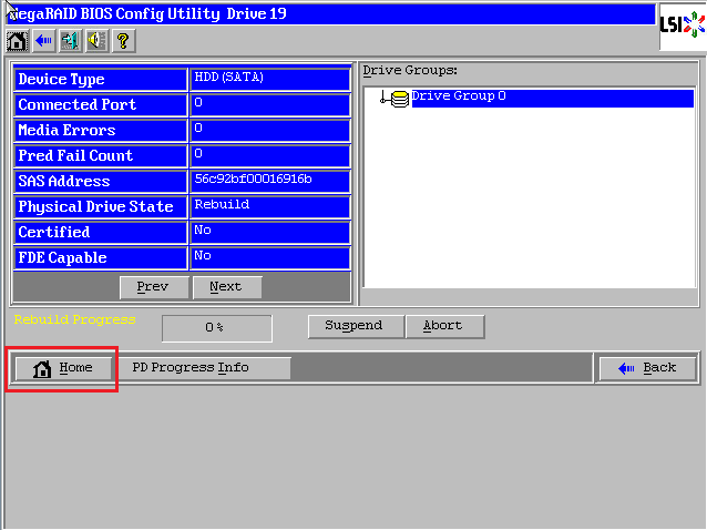 回到WebBIOS主页,报错硬盘现在变成了褐色Rebuild状态。如果您着急使用,请点击【Exit】退出,然后【Ctrl-Alt-Delete】组合键重启服务器,同步过程可以后台进行。我们建议等同步完成再使用,查看同步进度请点击左下角【PD Progress Info】