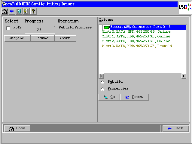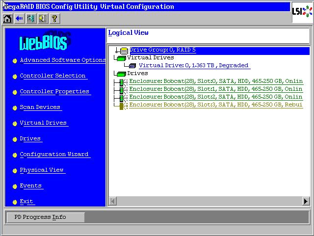 回到WebBIOS主页,阵列不再是红色Offline损坏状态,第四块硬盘褐色Rebuild状态表示正在恢复阵列至正常状态。请点击【Exit】退出,然后【Ctrl-Alt-Delete】组合键重启服务器,顺利的话系统可以正常启动!修复过程可以后台进行。您也可以等待修复完成后在使用,查看同步进度请点击左下角【PD Progress Info】