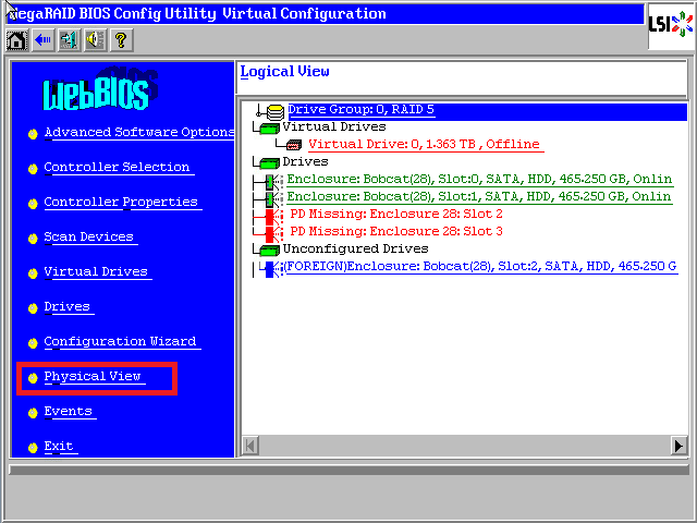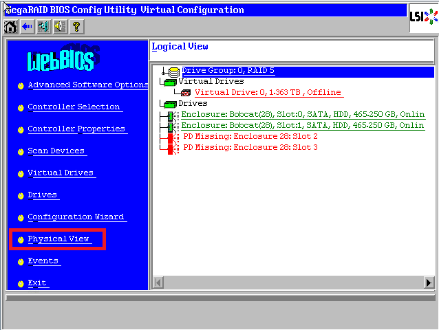 进入WebBIOS主页,发现多块硬盘显示红色PD Missing状态,阵列已经挂掉变成了红色Offline状态,此时数据已经不可用,点击【Physical View】进入物理视图。