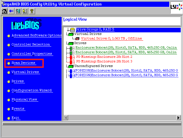 出现一块蓝色硬盘显示Foreign Unconfigured Good状态,点击【Scan Devices】