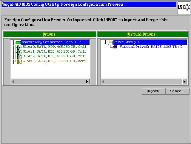 可以看到故障发生前的阵列状态,除了第四块硬盘,其余都是绿色Online正常状态,阵列也恢复为蓝色Degraded(降级状态,此时数据已经恢复可用),点击【Import】导入配置。