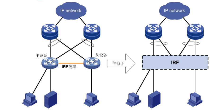 IRF(Intelligent Resilient Framework,智能弹性架构)是H3C自主研发的软件虚拟化技术。它的核心思想是将多台设备连接在一起,进行必要的配置后,虚拟化成一台设备。使用这种虚拟化技术可以集合多台设备的硬件资源和软件处理能力,实现多台设备的协同工作、统一管理和不间断维护。