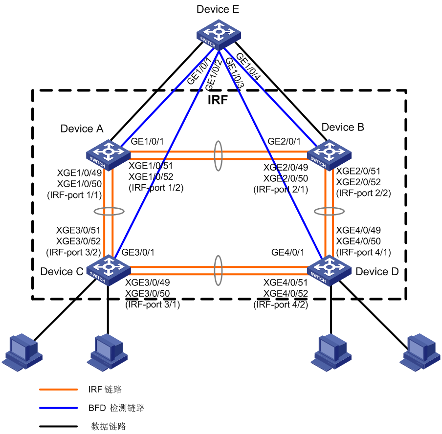 · 鉴于IRF技术具有管理简便、网络扩展能力强、可靠性高等优点,所以本例使用IRF技术构建网络汇聚层(即在四台设备上配置IRF功能),每台成员设备与上层设备Device E之间均有一条上行链路连接。