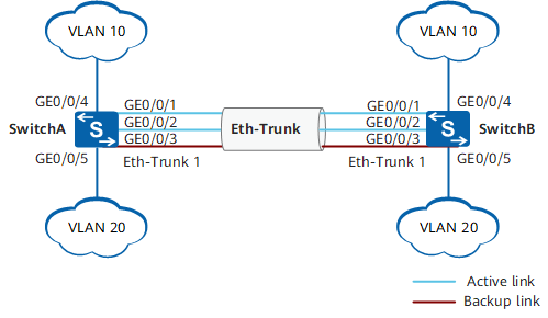 如图3-75所示,SwitchA和SwitchB通过以太链路分别都连接VLAN10和VLAN20的网络,且SwitchA和SwitchB之间有较大的数据流量。