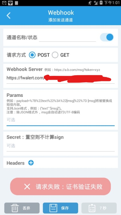 用高通随身WIFI安装短信转发 GitHub应用,设置通道时,提示证书验证失败。